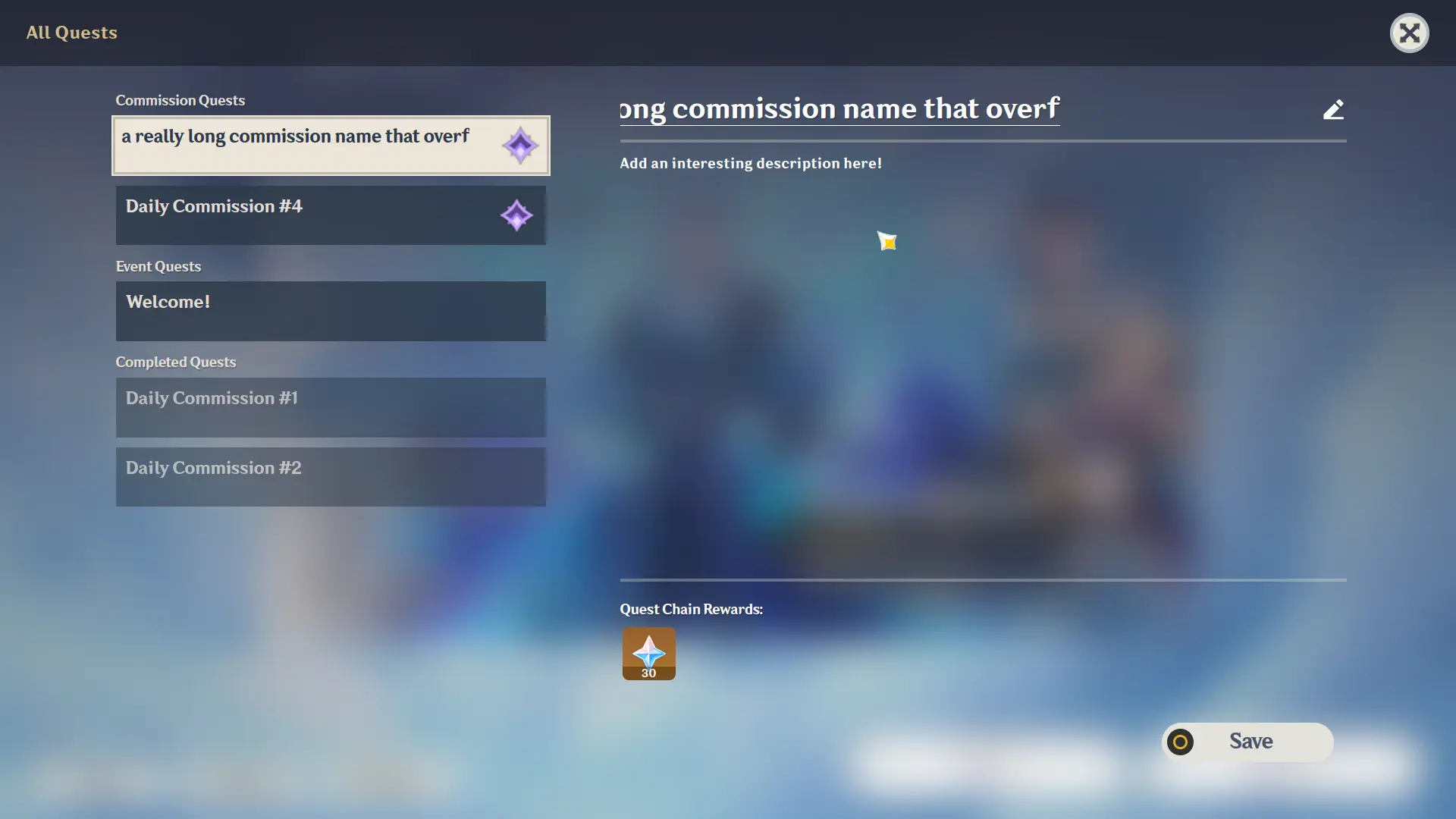 First, there is a character limit in the title, and the box height has been slightly increased to allow multiline titles to properly overflow. Daily commissions now have icons to make it more obvious and also to copy the base game. Lastly, a bunch of bugs related to lists and quest ordering were squashed to avoid the janky horror that was pre-1.4 quests.